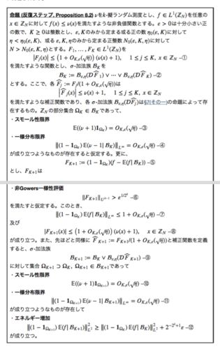 §3 Overview of proof では証明のスキーム 或るという対象がある。 には或るランダム性と構造という概念を定義することができる。 を(構造化部分)+(誤差項)に分ける構造定理を示す。誤差項はランダムな部分。 誤差項を取り除く一般化von Neumann定理及び構造…